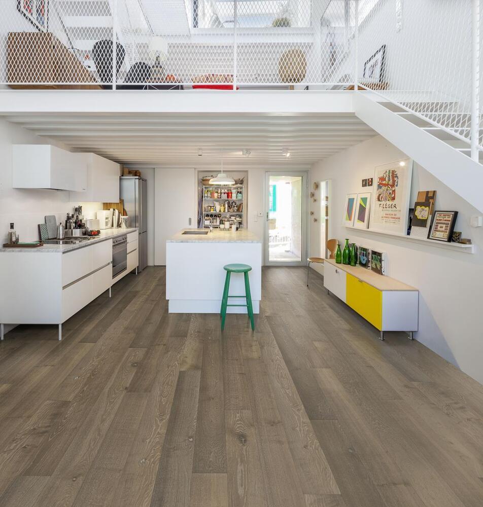 Ek Nouveau Greige, är ett klassiskt grått infärgat 1-stavs/plankgolv med mikrofasning. Ytan är borstad och för att tydliggöra strukturen ytterligare har man gett porerna en lättare grå ton. Den varierande strukturen i brädorna, kombinerad med både ljust grå och mörkare kvistar, ger golvet en genuin träkänsla.