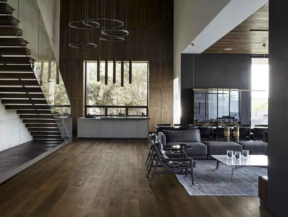 Nouveau Tawny, är en pigmenterad mörkbrun och matt lackerad planka/1-stav med kontrast av ekens naturliga färgvariationer. Kan innehålla stora kvistar. Borstad, med mikrofasade kanter.