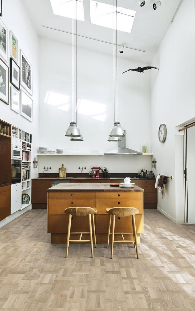 Ek Palazzo Bianco, är ett vitpigmenterat golv med stavar i holländskt mönster. Golvet levereras som färdiga mönsterbrädor och installeras på samma enkla sätt som andra Kährs flerskiktsgolv. Var noga med mönstret vid läggning.