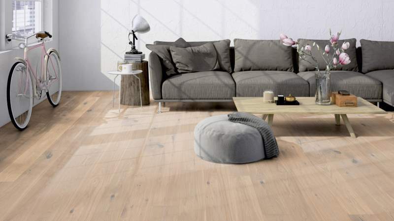 Yta: Vit, mattlackerad och borstad yta, vilket ger golvet ett ljust utseende.