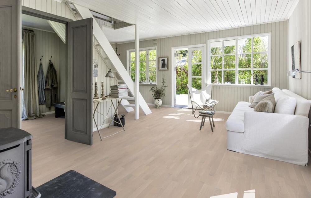 Ek Chalk, är ett lugnt ljust ekgolv med en kalkliknande färgton. Detta 3-stavs golv har ett klassiskt men ändå modernt och tidlöst utseende.