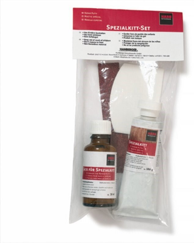 För åtgärd av större, bredare skador på träytan, som t.ex. tryckmärken, hack, flisor osv. Reparationspasta i set inkl. lack, spatel och sandpapper.
