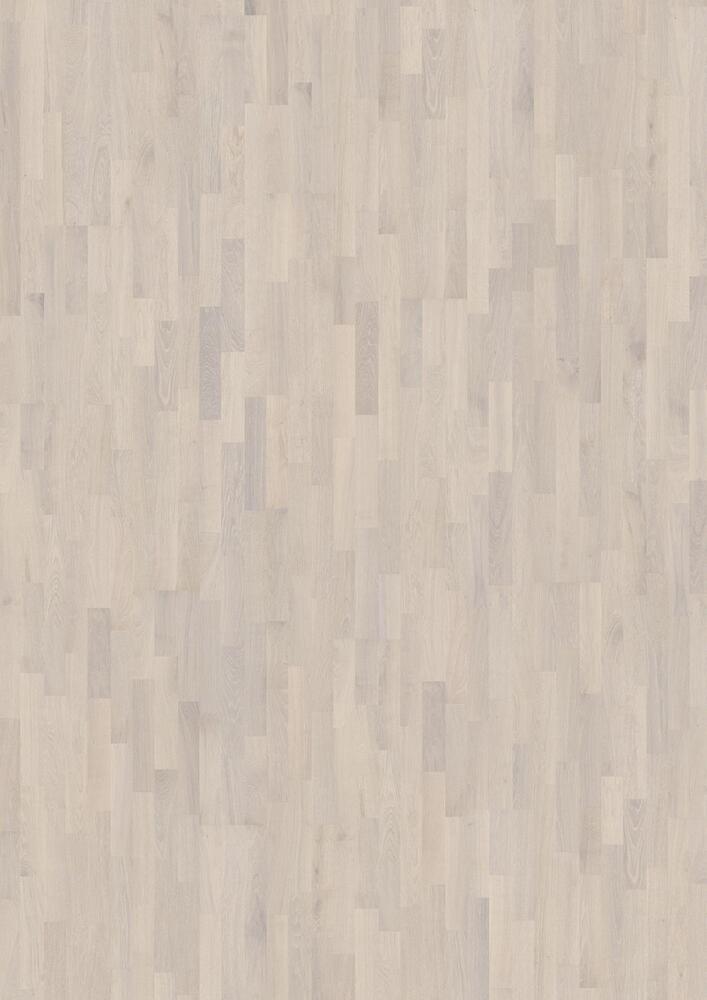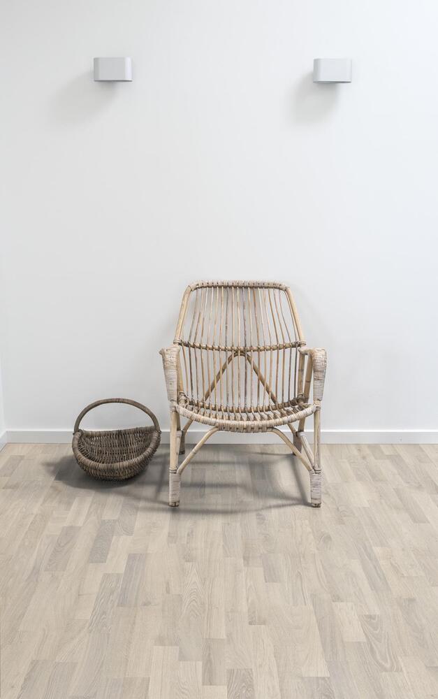 Ek Rime, Den halvtransparenta vitlaseringen av detta borstade 3-stavs-golv i ek från Lumen-kollektionen skapar balans mellan träets ljusa och mörka kontraster, så de raffinerade, varma färgtonerna i ek framträder mjukt. Den ultramatta lacken framhäver träets naturliga variationer och får golvet att likna nyhyvlat virke. Detta minskar effektivt bländning och skyddar golvet mot dagligt slitage.