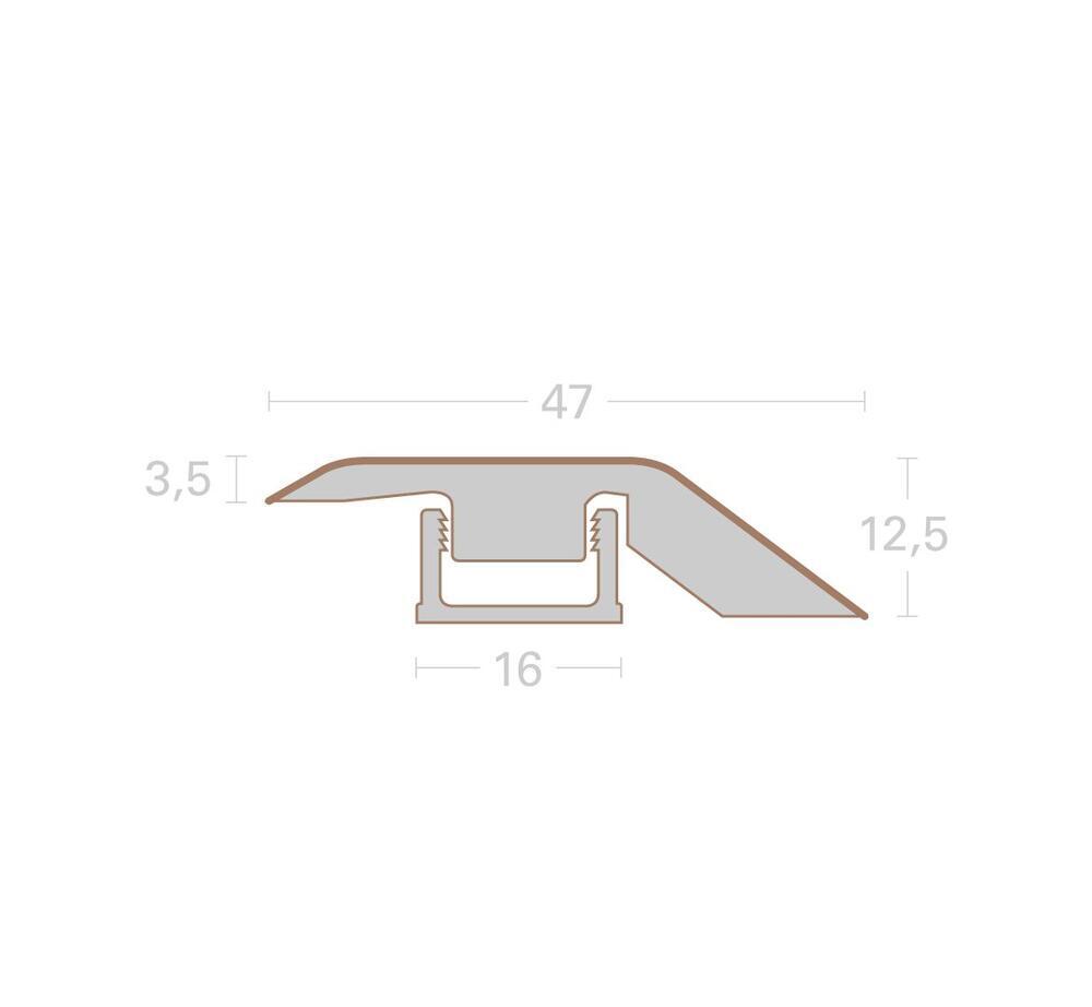 Parador Modular ONE HDF-tilpasningsprofiler er et "true-match" og er identisk med dekor og struktur for designet af samme navn. Højdeforskelle mellem gulve på op til 9 mm udlignes dygtigt med disse Parador tilpasningsprofiler. På trods af en højdeforskel kan der således skabes en perfekt gulvflade – helt uden steder, hvor man snuble.1000 x 47 x 12 mm.