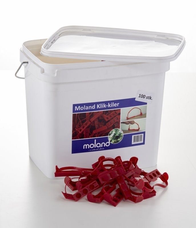 Moland Klik-kiler är en hink med 100 plastklickkilar. Dessa klickkilar är perfekta för att hålla ett jämnt avstånd runt ditt golv vid läggning. Varje kil består av två delar som enkelt klickas ihop, vilket ger justerbarhet och gör det enkelt att hålla ett enhetligt avstånd längs golvets kanter.