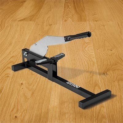Manuell skärare i stål. Med flyttbar bock för långa plankor och dammsamlare ingår.