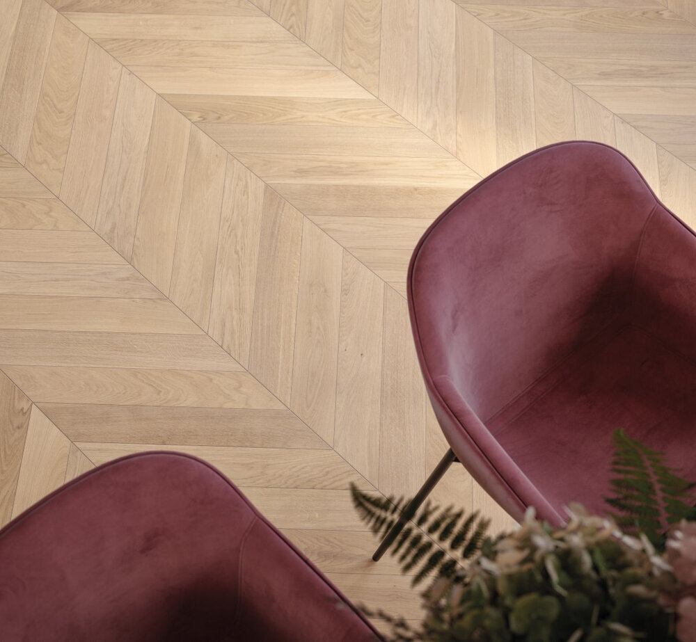 Fas/skarv: Minifas på 4 sidor. Den omgivande minifasen M4V bryter diskret det lagda plankornas utseende och framhäver det typiska lamellparkettutseendet.