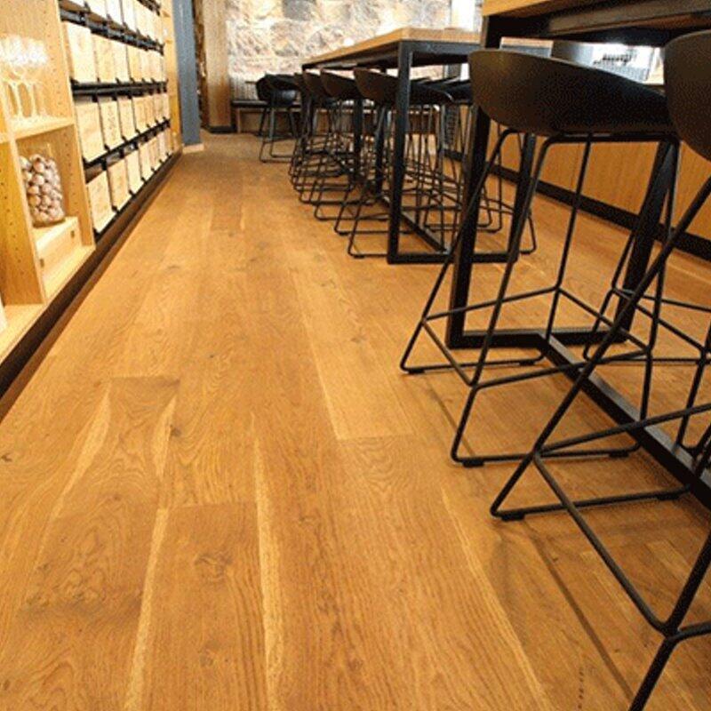 De olika typerna av ytbehandlingar som vi erbjuder framhäver husets unikhet och ägarens personlighet. Plankgolv i ek skapar en genuin atmosfär av komfort och lugn i hemmet samt en mycket behaglig yta att gå på. Robust och hållbart, har ek länge använts för golvproduktion och ger ett fint utseende och en lång livslängd för ditt nya ekgolv. Du kan lugnt räkna med ett vackert resultat i årtionden.